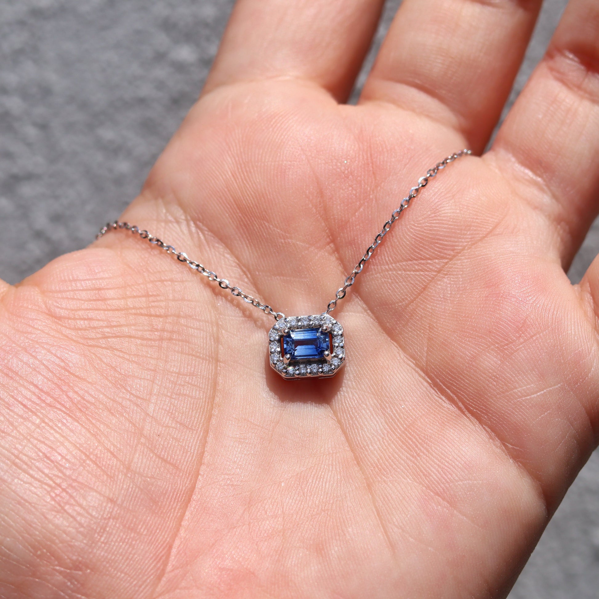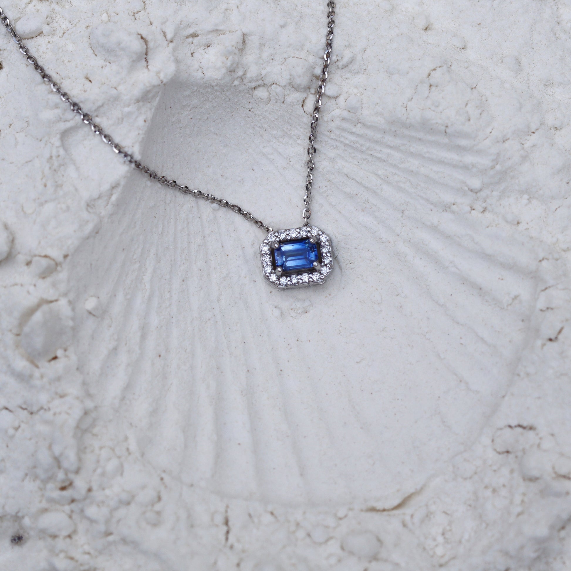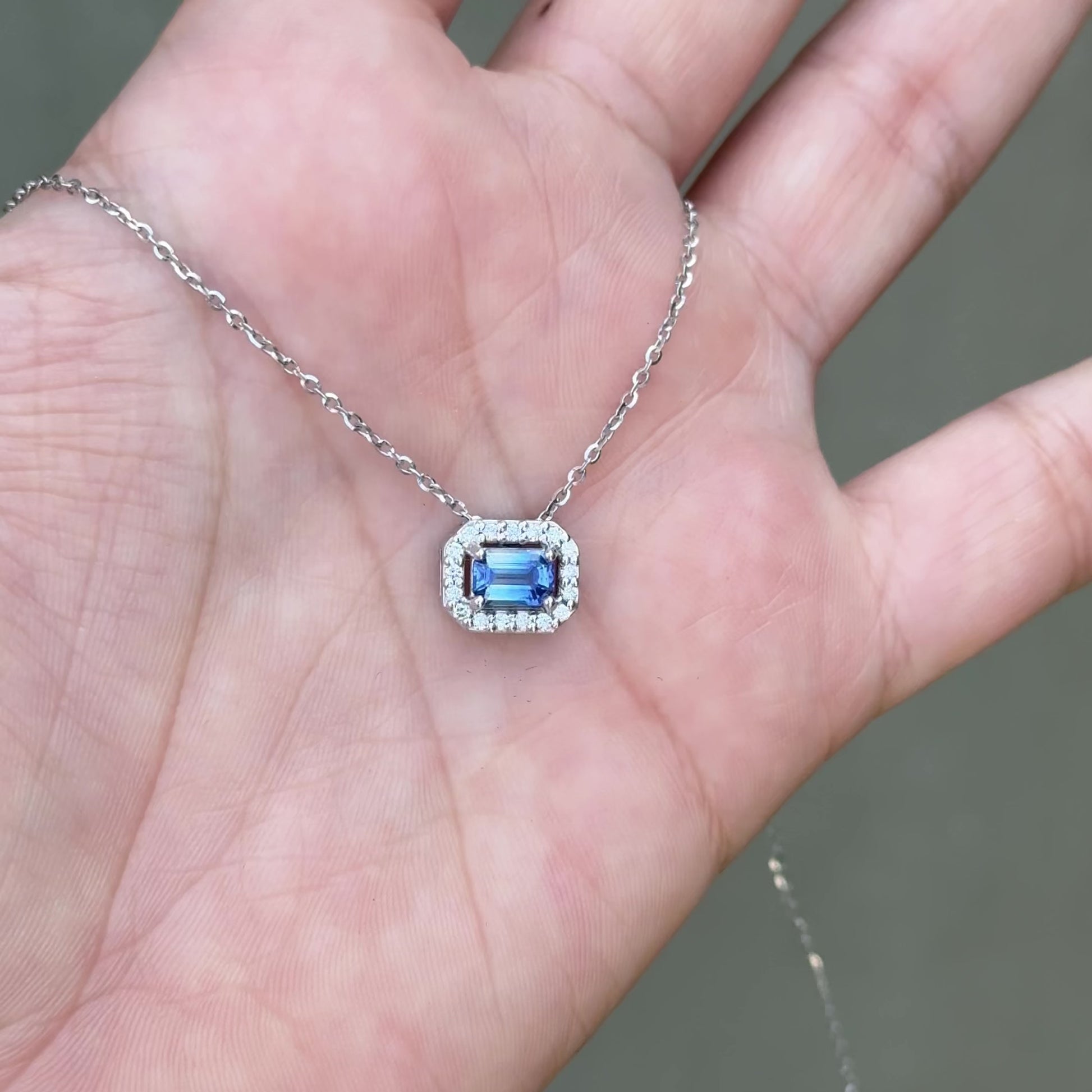 El zafiro bitono, con su fascinante transición de color, es el protagonista absoluto: una gema natural en corte esmeralda que refleja profundidad, equilibrio y elegancia. Su marco de diamantes naturales crea un halo de brillo que resalta cada destello interno de la piedra, mientras el oro blanco de 14k aporta un acabado atemporal y sofisticado.
